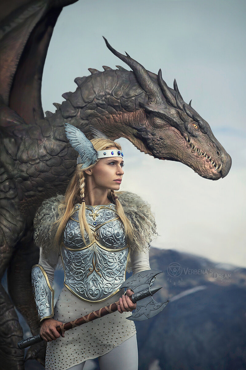 Еще один из сумасшедших образов, который я не менее сумасшедше потащила в большую фотопоездку на Кавказ и дотащила до самой вершины Эльбруса))) Самой сумасшедшей идеей было притащить на канатках прямо на вершину огромные белые крылья на 4 метра в размахе, сделанные из натуральных маховых индюшачьих перьев. Я не знаю как мой муж и фотограф вписались в эту авантюру, наверное у меня на тот момент слишком сильно горели глаза, чтобы что-то возразить))) Я заказала у ставших мне уже родными крафтеров из Киева женский нагрудник и наручи, перекрасилаих в сияющее серебро, бахнула золотца и вставила синий кабошончик из чешского стекла. Примерно так же я поступила с парой обуви - для комплектности. С поддевкой я решила не усложнять - белые удобные леггинсы с эффектом под кожу и удлинненная ассиметричная трикотажная туника с золотой фурнитурой по нижнему краю. А вот на головной убор Валькирии сильно напрашивались крылья. Но белых крыльев я найти не смогла - ну днем с огнем не сыщешь. Пришлось брат