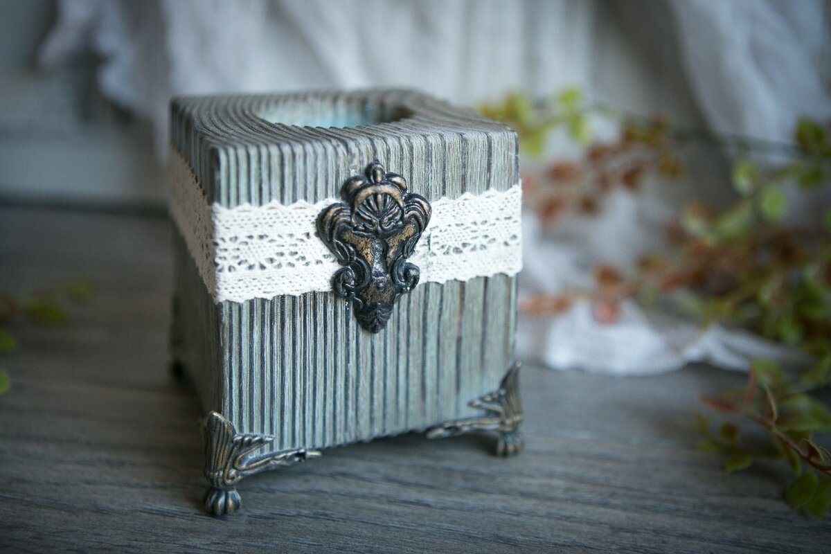 Предметы декора в стиле кантри очень милые и уютные, они дарят приятную атмосферу и тепло бабушкиного дома. И, что немаловажно, их достаточно просто сделать своими руками. Для работы нам понадобится: - заготовка соснового подсвечника-бруска (можно сделать самостоятельно) - газовая горелка - щетка по металлу - акриловые краски - ножки для шкатулки - самозатвердевающая масса Jovi или DAS - силиконовый молд - кружево - клей Момент монтаж Жидкие гвозди - металлизированный воск или краска-металлик. Чтобы получить красивую текстуру на древесине, нам необходимо обжечь подсвечник с помощью газовой горелки. Во время обжига, старайтесь не задерживать горелку на одном месте, а равномерно водите ею вдоль волокон. Степень обжига регулируйте по своему желанию, я люблю обжигать сильно, чтобы рельеф после брашировки был глубоким. Теперь берем щетку по металлу и «вычесываем» всё, что выгорело (сильнее выгорают всегда мягкие волокна древесины и, благодаря этому получается красивый рельеф). Водим щетк