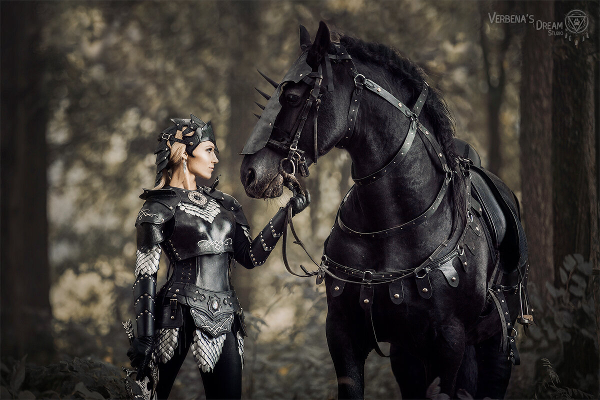 Снимки с этой съемки облетели, наверное весь интернет. С этого образа началось моё долгое и тесное сотрудничество с семьей кожевников Березиных из Геледжика. Я связалась с кожевницей Лилией через интернет, увидев её работы, и предложила выйти из зоны комфорта и сделать для меня кое-что необычное и непривычное. Обычно кожевники морщат нос и предпочитают делать привычные ремни да кошельки, но когда я примерно показала-рассказала Лилии, что хочу, она загорелась и согласилась взяться за этот проект. И мне очень понравилось как она работает - ответственно, скрупулезно, выверяя каждый шаг. Впоследствии я ещё не раз к ней обращалась со своими идеями. Комплект был задуман полностью из кожи как доспех, но в женственном виде. Верхняя его часть состоит из укороченной кирасы с формованной грудью, а под кирасой - плотный кожаный корсет. Сверхну надевается кожаное латное ожерелье, к которому крепятся наплечники.Снизу - фигурный широкий пояс с камнем и отстегивающимися тассетами на бедра. На руки -