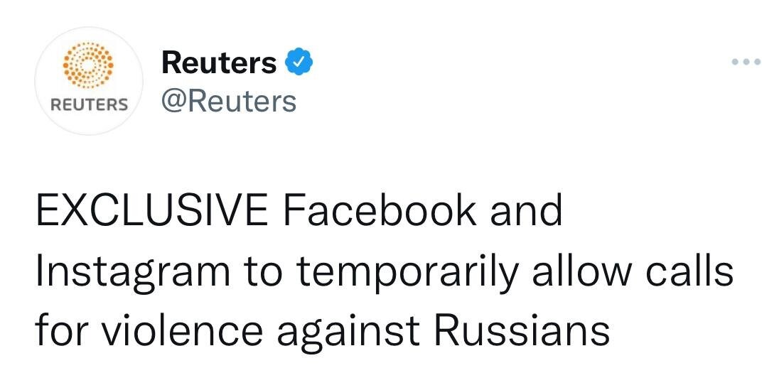 «Фейсбук» и «Инстаграм» временно не будут блокировать призывы к убийствам русских. Временно, видимо, пока всех русских не убьют. На мой взгляд, это схоже с работой нацистских изданий «Фёлькише Беобахтер» и «Штюрмер», которые бы во всеуслышание объявили, что будут временно призывать к убийствам евреев. Временно. До окончательного решения еврейского вопроса.