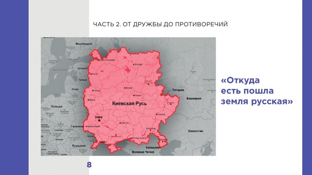 Много ещё всякого интересного. Можете сравнить сами с реальными границами древней Руси. Доставляет также Великая Чечня. Причем это современное название (как можно понять, чёрным шрифтом вокруг Руси выделены современные государства). Наконец, текст презентации просто безграмотный, с орфографическими ошибками. Такой вот час «Исторической правды» для неокрепших умов.