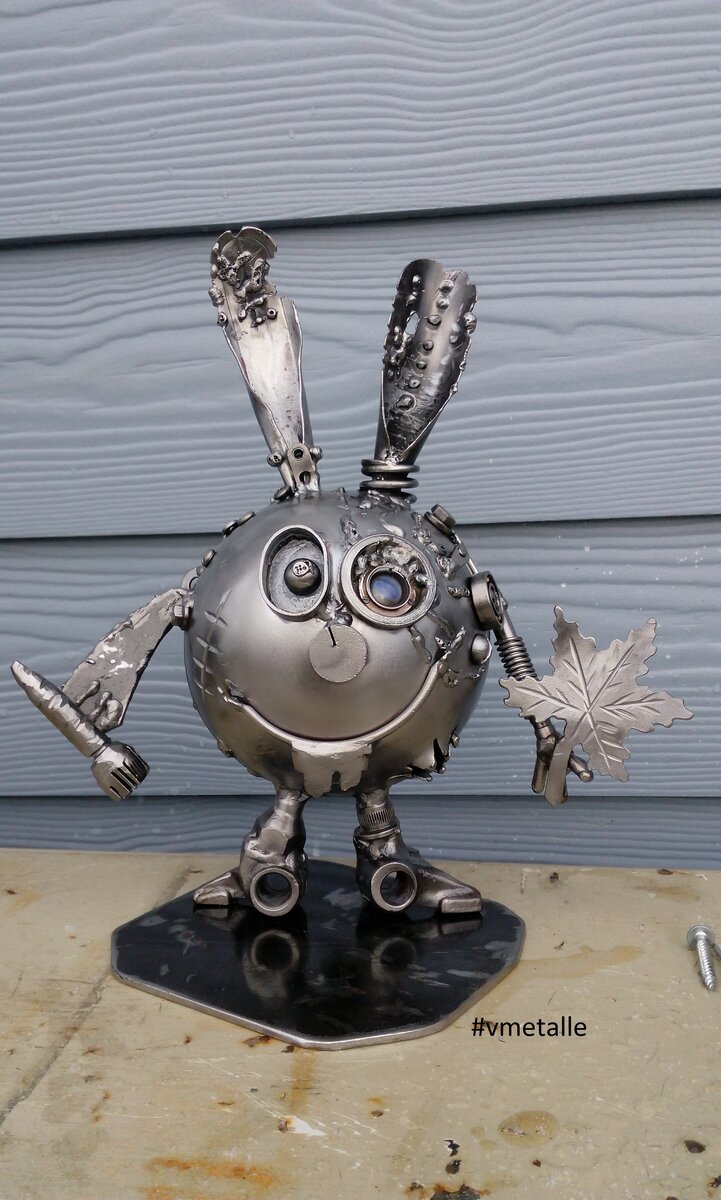 Полусферы куплены в строймаге,остальное-металлолом. I'LL be back autumn!!! Ноги-успокоители цепи грм Москвич,болты,колесные гайки,шарики,пружинки Уши-часть плойки для волос и ручка порошкового огнетушителя глаза-часть трубы с сиденья ваз 2112,часть объектива с китайского фотоаппарата Накидал винтиков,шурупчиков,добавил порезы,шрамы,ссадины,разрывы от пуль.листик клена просто вырезал из листового металла,остр