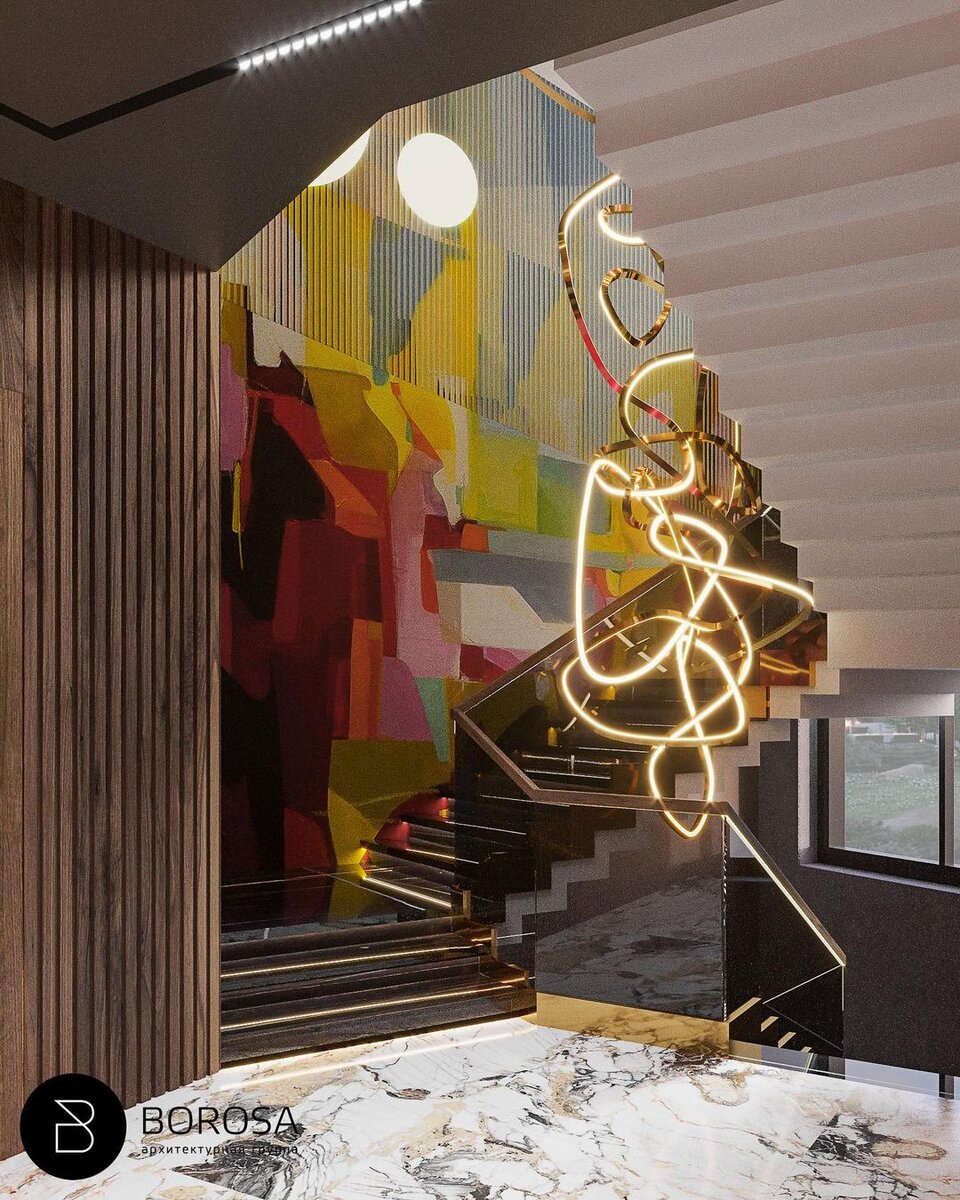 Обширная площадь стены вдоль лестницы решена работой современного художника. Такой смелый приём привлекает к себе внимание и создает замопинающийся и уникальный образ этого пространства!