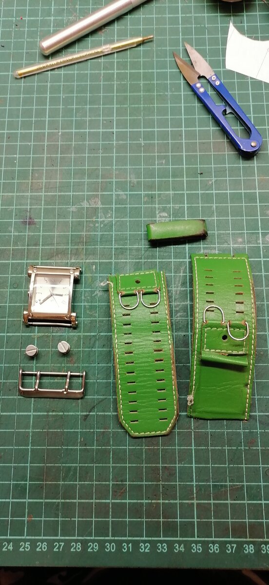 Не так давно ко мне обратился человек с вопросом "Можно ли сделать новый ремешок для наручных часов?" . Я недолго думая попросил принести мне часы, чтобы посмотреть что можно сделать. Ремешок был порезан пополам и выглядел довольно плачебно. Я взял ремешок с часами в работу. Первое что я сделал, это самое важное, обсудил с клиентом каким должен быть новый ремешок, какой цвет, размер и какие еще могут быть пожелания. Придя в мастерскую, я отделил старый ремешок от часов и фурнитуры. Фурнитуру было решено сохранить и перенести на новый ремешок. Старый ремешок я использовал как лекало для нового. Снял с него основные размеры длину, ширину, расположение отверстий. Отрисовал все на бумаге и сделал основное (рабочее) лекало которое уже перенес на кожу. Кожу использовал Российского производства, это пола фиолетового цвета толщиной 1,3мм. Перенеся лекало на кожу, я сделал черновой раскрой кожи. Получилось несколько полос кожи которые были склеены между собой и обрезаны уже в чистый