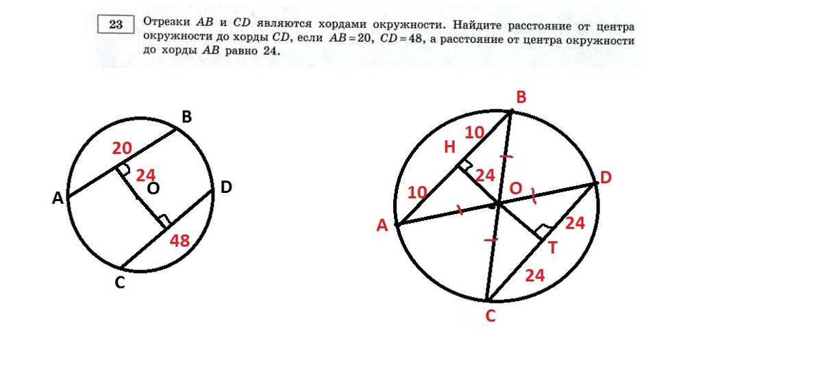 Отрезки АВ и CD являются хордами окружности. Найдите расстояние от центра окружности до хорды CD, если АВ = 20, CD = 48, а расст