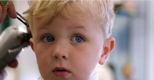 Тут Максим понимает, что его уже не будут стричь, и начинает канючить, поглаживая пухленькой рукой свою стриженную голову: