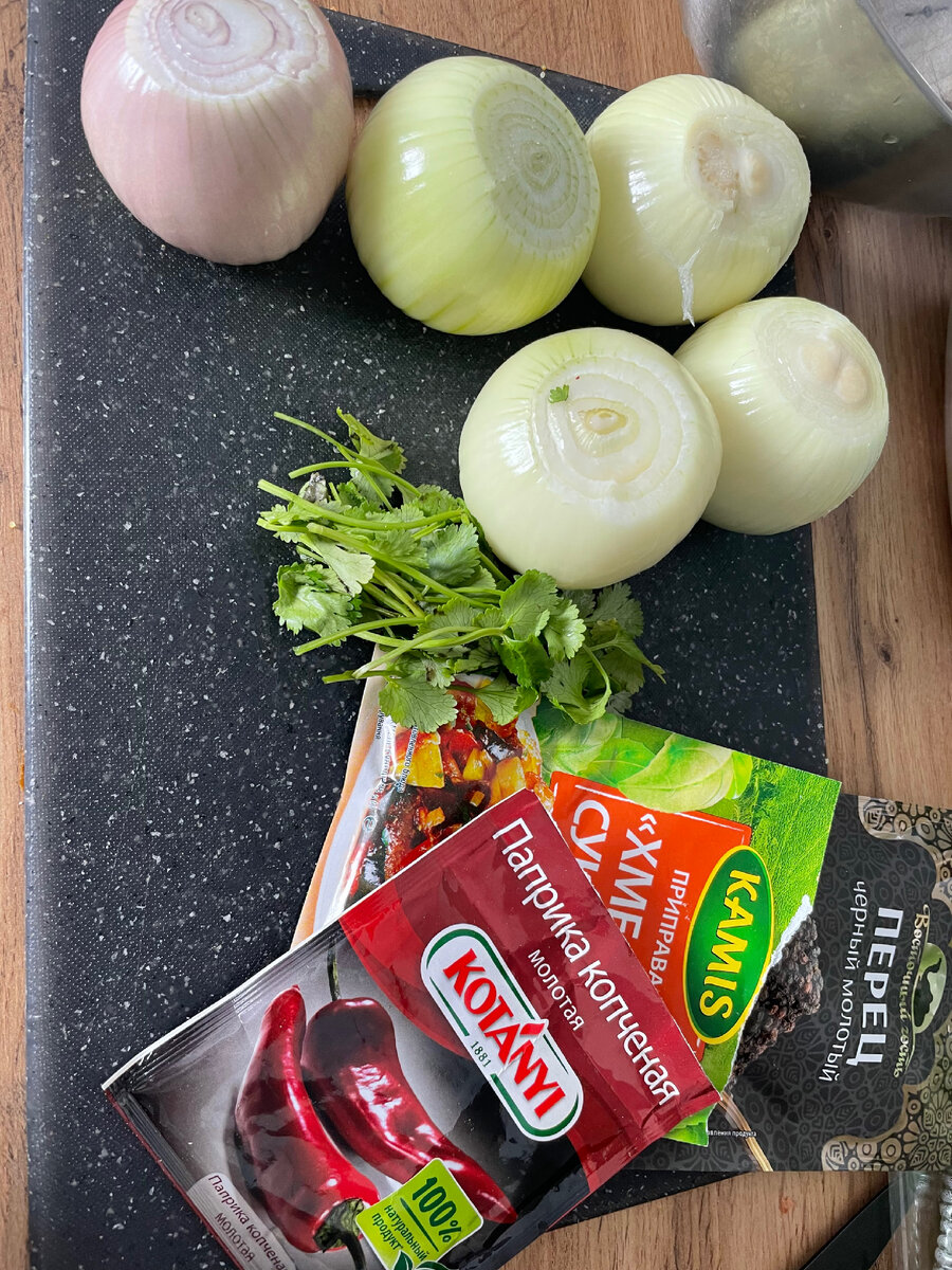- нам понадобится: свиная шея-1кг, лук репчатый 4 головки( 2 пойдут в маринад), пучок кинзы( половина пучка пойдёт в маринад как базовая специя), паприка копчёная 1ч.л, соль 1 1/2 ч.л., специи для шашлыка или любая смесь( у меня хмели сумели, томатная паста 2 столовых ложки(развести в 150 мл питьевой воды), 1ст.ложка уксуса 9%,масло растительное 2ст.ложки.