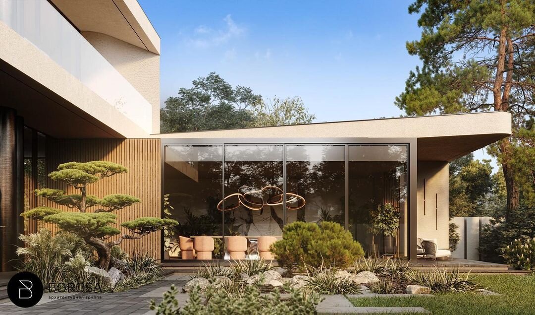 Производит впечатление и эстетическая составляющая: эффектные линии кровли соответствуют лейтмотиву основного строения. Но самое большое преимущество этой беседки – трансформируемое остекление. Благодаря ему беседка превращается в крытую террасу, создавая единое пространство с внутренним двором. В этот момент все три составляющие – архитектура, интерьер и ландшафт объединяются в цельную композицию.