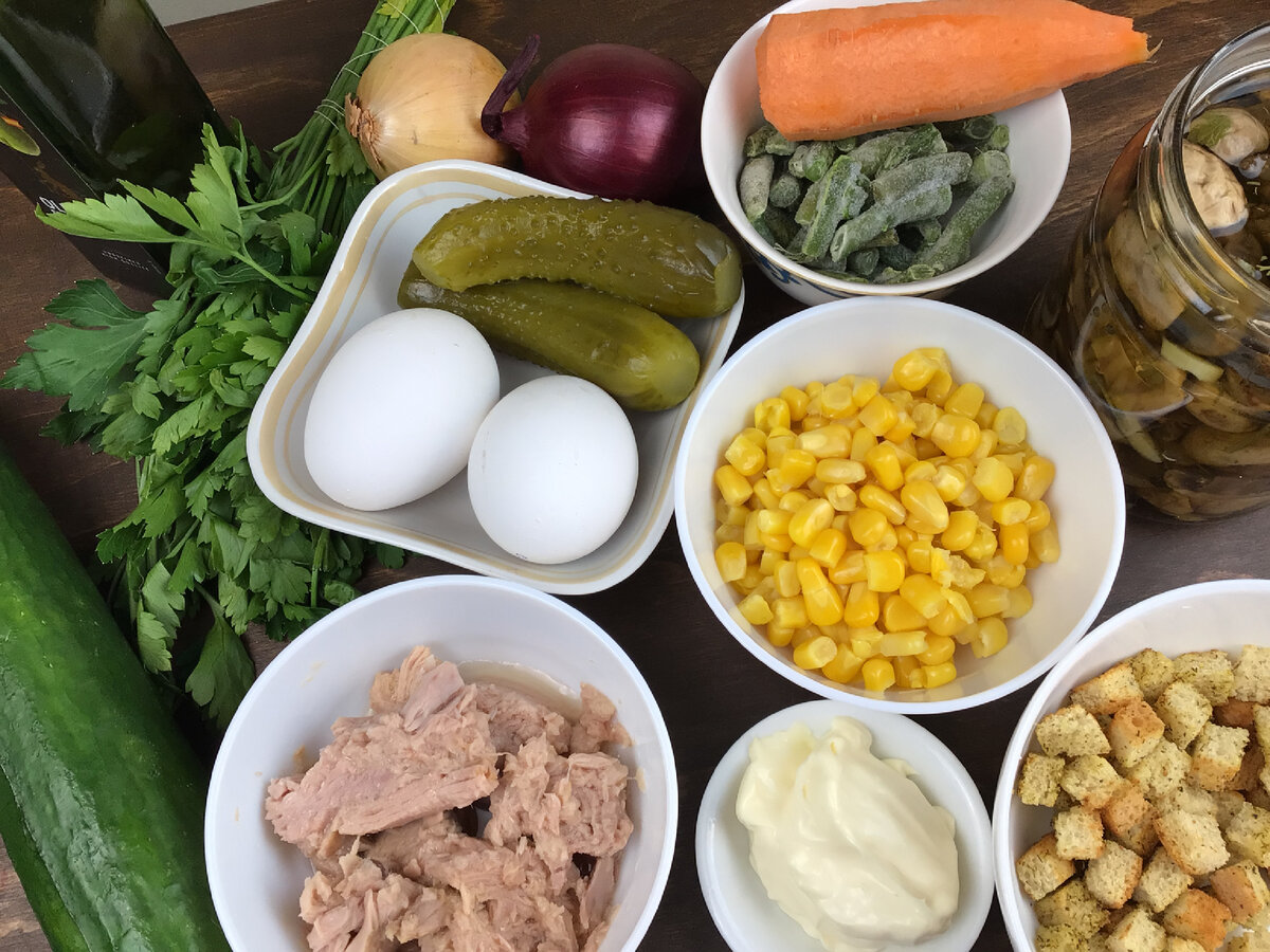 Салат с тунцом один из самых распространённых рыбных салатов. Мясо тунца жирное , без косточек, поэтому идеально подходит для приготовления салатов. Эти салаты очень простые и быстрые в приготовлении. При этом, я стараюсь каждый раз разнообразить ингредиенты в салатах. Салат с тунцом и солёным огурцом. . В салат используем мелкие сухарики. Нарезаем хлеб на мелкие кубики. На горячей сковородке растапливаем сливочное масло, добавляем специи по вкусу, все перемешиваем и бросаем туда нарезанный кубиками хлеб. Все хорошо пережариваем, чтобы сухарики чуть- чуть зарумянились. После этого, перекладываем на бумажное полотенце, и даём сухарикам остыть. Мясо тунца не разминаем, а разбираем по волокнам на мелкие кусочки. Солёный огурец, сваренные яйца и красный лук нарезаем кубиками. Добавляем консервированную кукурузу. Всё перемешиваем и заправляем майонезом. Салат готов. Салат из тунца со свежей зеленью. Свежий огурец, морковь, яйца нарезаем мелкой соломкой. Мясо тунца разделить на ку