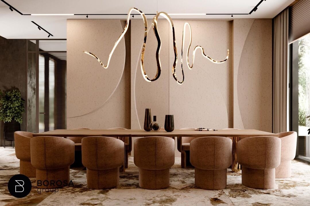 Столовая загородного дома PARUS в уютных ультрамодных оттенках цвета жженого кирпича с акцентами золота