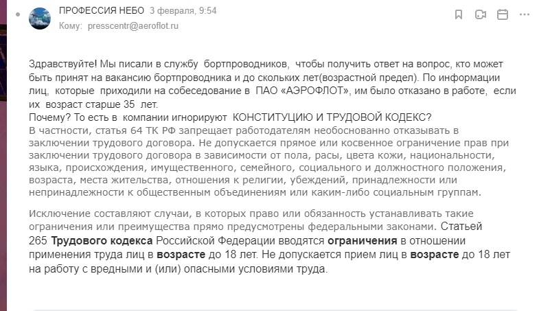 Напомним, ранее мы отправили письмо в авиакомпанию, где задали несколько вопросов, в Аэрофлоте посчитали, что проигнорировать будет правильнее, чем ответить ... Генпрокуратура должна была проконтролировать, почему авиакомпания посчитала, что может нарушать свободу слова в России, не отвечая на запросы Интернет-платформ... Не нужно потом обижаться, что у людей страны складывается неправильное впечатление о главном авиаперевозчике... Ответ мы должны были получить ещё до 5-го Марта, но, увы... Пишем сами, публикуем других авторов : professiya.nebo@bk.ru