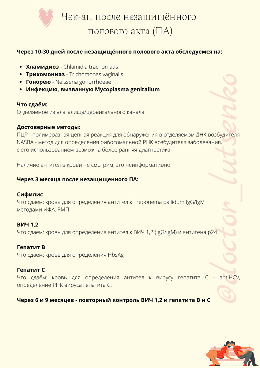 Что делать после незащищённого полового акта? Конечно, обследование на инфекции, передающиеся половым путём. Какие инфекции, когда сдавать и какой биоматериал подойдёт - ответ в приложенных изображениях.