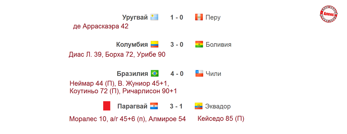 Уругвай обыграл Перу в отборе на Чемпионат мира 1:0 и оставил их без прямой путёвки. Сборная Уругвая выиграла третий тур кряду. В то время, как их соперник не уступал никому 6 матчей. Колумбия была лучшей в матче с Боливией 3:0. Владения мячом у хозяев составило 76%. Боливийцы потерпели третье фиаско подряд. Бразилия разгромила Чили 4:0. После поражения от аргентинцев в кубке Америки, Пентакампеоне не уступают ровно 10 матчей (7 побед и 3 ничьи). Парагвай обыграл третью команду Южной Америки Эквадор 3:1. Эквадор 3-й тур остаётся без побед, однако стало известно, что эта сборная вышла на чемпионат мира. А Парагвайцы 6 месяцев не знали побед. Аргентина сыграет с аутсайдером Венесуэлой 26 марта. А заключительный тур пройдут в один день. 30 марта Бразилия сыграет с Боливией, а Аргентина отправится в Эквадор. Перу – Парагвай, Чили – Уругвай, Венесуэла – Колумбия. Лучшие бомбардиры: Морено Мартинс забил 10 голов. У Неймара - 8. Бразилец остаётся лучшим ассистентом квалификации. Смотрим на и