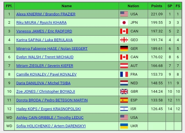 Одни из главных претендентов на золотую медаль - американцы Эшли Кейн и Тимоти Ледюк не смогли завершить своё выступление. Признаюсь честно, я не фанат этой пары, и не очень хотела, чтобы они взяли золото, но точно не таким образом. В начале программы Эшли упала с недокрученного тройного ритта, затем не смогла устоять на выезде с выброса - было ощущение, что фигуристка"не в ногах". В середине программы спортсмены пошли на запланированный каскад 3С+2Т+3Р, и тут Эшли упала в третий раз - с сальхова. Чисто визуально - падение как падение, мы видели и пострашнее. При падении Эшли приземлилась на попу, но вполне возможно что потом она ударилась об лёд виском. Что тут сказать... Конечно, хочется пожелать Эшли здоровья. Пожалуй это был их единственный шанс завоевать золотую медаль на чемпионате мира. Видео: В итоге золотую медаль взяла другая американская пара, лидеры по итогам короткой программы - Алекса Книрим и Брэндон Фрейзер. Фигуристы показали чистый прокат, хотя, конечно нельзя не отм