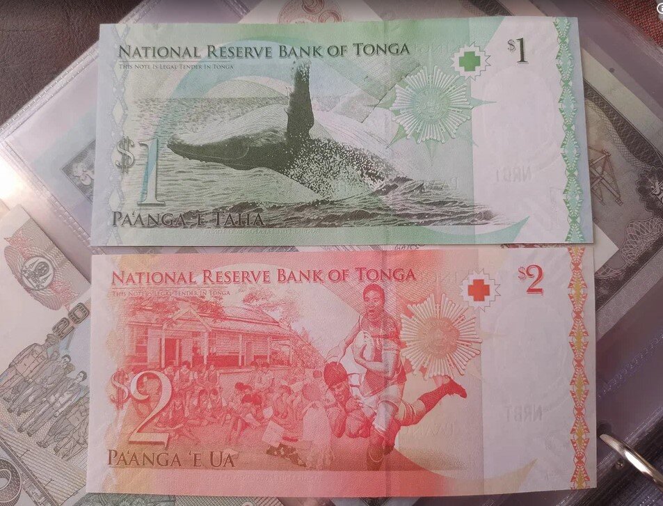 На банкноте в 1 паанга изображен кит, а на банкноте в 2 паанга изображен фрагмент из игры регби.