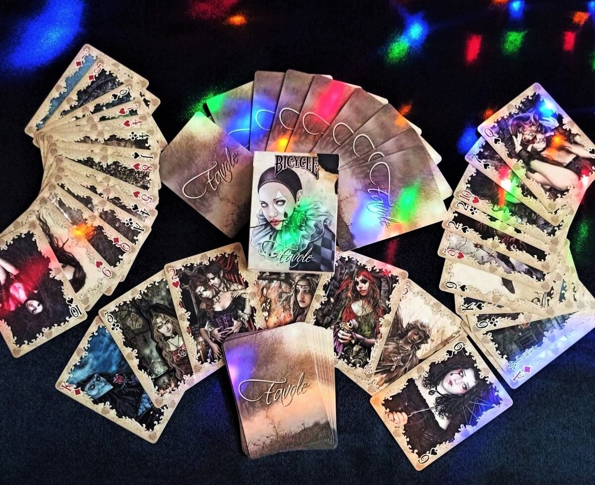 Профессиональная игральная колода «Bicycle Favole» - в переводе с итальянского языка означает «Басня». Колода оставила у меня самые хорошие впечатления, качество колоды великолепное, в руках колоду держать очень приятно и особенно её тасовать. Карты отлично скользят в руке, с ними можно выполнять различные манипуляции, также отлично подходят для фокусов. Прежде всего, карты меня заинтересовали в качестве предсказательного инструмента. Колода "Bicycle Favole" – была создана под влиянием книги Виктории Франсес «Favole». Виктория Франсес –талантливая испанская художница, модель и писательница. Её картины в которых выполнена колода наполнены мистикой, вампирами и готической романтикой. Сами карты пластиковые. Поверхность карт выполнена из высококачественной бумаги и имеет фирменное покрытие Air Cushion. В верху коробки можно увидеть надпись Bicycle – это классические американские карты, которые выпускаются United States Playing Card Company в США. Колода упакована в коробочку из плотного к