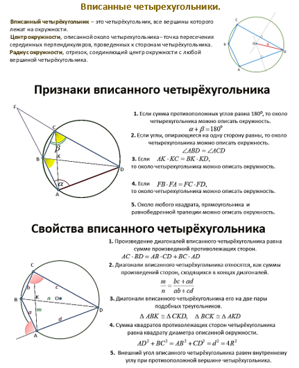 Готовимся к ОГЭ и ЕГЭ. Признаки и свойства описанной окружности около четырёхугольника.