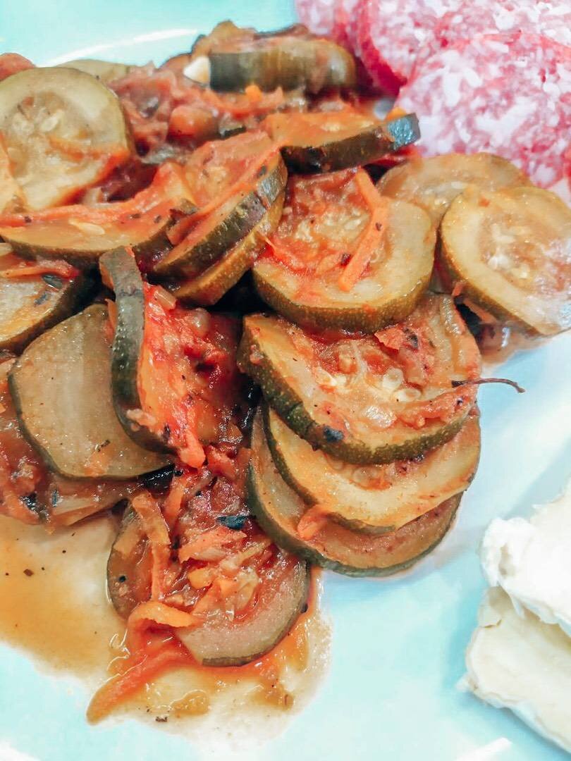 Прекрасная идея для овощного гарнира или полезного основного блюда. Аппетитные, вкусные и яркие кабачки, тушенные с морковью и луком в домашних условиях, предлагаю вашему вниманию. #кабачки #тушенныекабачки #постноеблюдо #постноеменю #меню Ингредиенты: лука, моркови, кабачков, чеснока, растительного масла, лаврового листа, томатного соуса, соль, перец, итальянских трав Способ приготовления: Подготовьте ингредиенты. Очистите и нарежьте полукольцами лук. Разогрейте на сковороде немного растительного масла, выложите туда лук. Обжарьте на среднем огне до прозрачности. Чеснок очистите и пропустите через пресс. Добавьте к луку и продолжайте жарить ещё около минуты. Очистите и натрите на терку морковь. Выложите ее на сковороду. Жарьте 2-3 минуты, периодически помешивая. Кабачки вымойте и нарежьте тонкими кольцами или средними кубиками. Добавьте к остальным овощами. Посолите и поперчите по вкусу, добавьте специи и травы. Добавьте соус и притушите все 15-20 минут. Готово!
