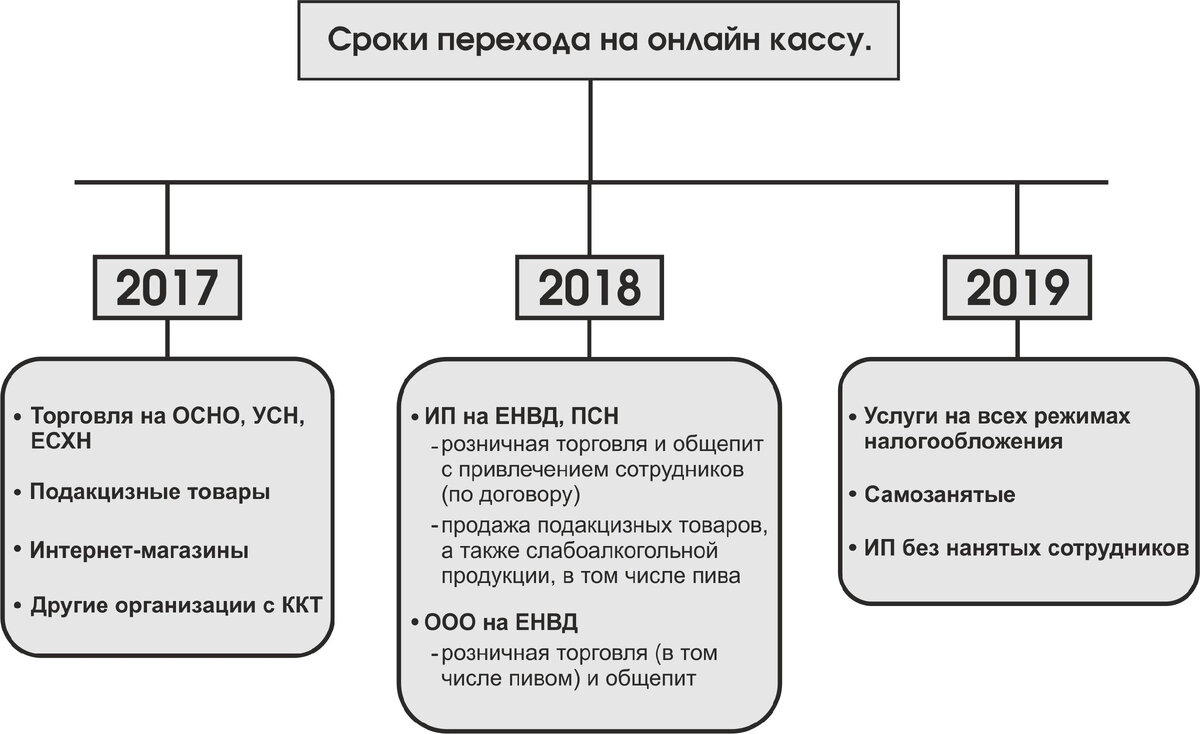 В соответствии с законом 54-ФЗ бизнес сегмент (торговля/услуги) экономики обязан к 2019 году перейти на онлайн кассы. Данная процедура была разделена на 3 этапа (см. табличку выше). Далее поговорим, с какого числа онлайн кассы обязательны, кому предоставили дополнительную отсрочку, и кто освобождается от установки нового оборудования. Обязательна ли в 2022 году онлайн касса для ИП на ЕНВД? Необходимость установки ККТ раньше зависела от самого предпринимателя: он сам мог выбирать, каким образом подтверждать продажу, товарным или кассовым чеком. На сегодняшний день процедура изменилась — все кассовые чеки передаются прямиком в налоговую. Предприниматели на ЕНВД должны были перейти на онлайн кассы еще в 2018 году, за исключением: 1. Ведущих деятельность в сфере общепита или розничной торговли товарами; 2. Выполняющих работы при наличии наемных работников. Отсрочка этим категориям предпринимателей давалась до июля 2019 года, поэтому с 1 числа все покупки должны быть подтверждены только че