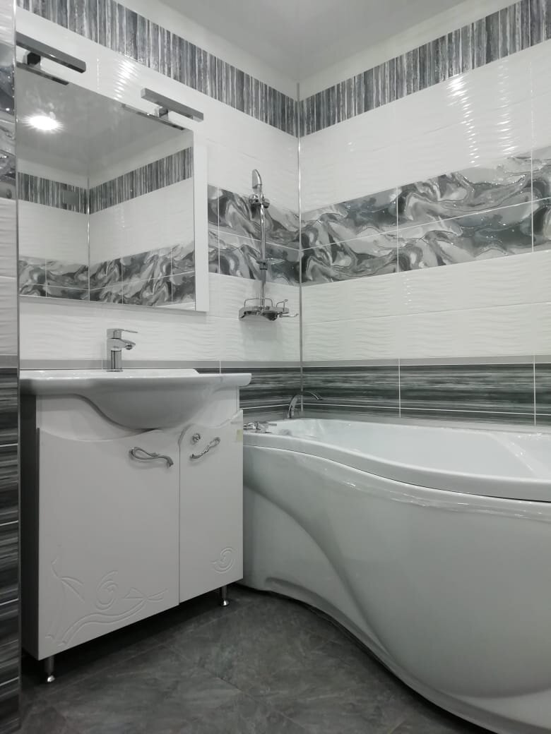 Разломали перегородку, ванна и туалет получилась единой комнатой,стало просторно, трубы сантехнические спрятали в стену