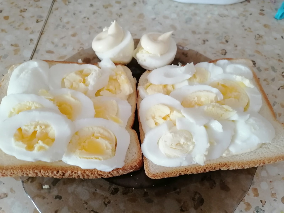 Сегодня ко мне в голову пришла забавная, но глупая мысль, создать рубрику для Дзена и группы ВК, в которой я буду делиться своими гастрономическими извращениями которые в основе своей заключаются в завтраке, но думаю в будущем я буду писать и о других рецептах, а пока что будет серия моих издевательств над яйцами. Сразу предупрежу, что эти посты будут не постоянными и спонтанными, когда на меня будет находить вдохновение. Сегодня у нас в лаборатории злого гения гастрономических извращений Маффина, ТОСТ ИЗ ВАРЕНЫХ ЯИЦ: на два бутера нам надо: 3 яйца (я сделал 4 поэтому одно просто лежит с мазиком), 2 ломтика хлеба и майонез. Шаг 1: варим яйца. Я предпочитаю слегка недоваренный желток, что бы добиться этого эффекта нужно положить яйца в холодную воду, довести до кипения, поставить огонь на средний уровень и ждать 3 минуты после кипения. (к сожаления я передержал эти яйца на полторы минуты, и желток практически приготовился). После приготовления залить готовые яйца ледяной водой, что бы