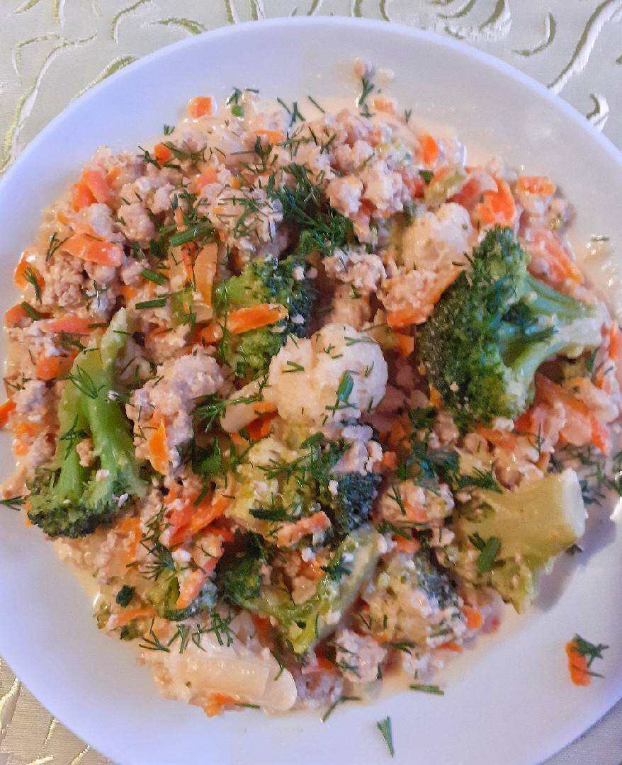 #меню #ужин #пп Очень вкусная, нежная и ароматная куриная грудка с овощами в соевом молоке с мягким сыром, отлично подойдёт для легкого и правильного питания. Ингредиенты: куриная грудка, лук, морковь, брокколи и цветной капусты, соевого молока, мягкого сыра, соевого соуса, бальзамического уксуса, чеснока, соль, специи Способ приготовления: Грудку порезать на мелкие кубики. У меня грудка домашней курицы, я перекрутила на мясорубке с крупной решёткой. Добавить в грудку соевый соус, бальзамический уксус, измельчённый чеснок, специи. Пока не солить. Оставить мариноваться 30 мин. Подготовить остальные ингредиенты. Достать из морозилки капусту. Можно взять только брокколи, но у меня оказалось мало, я добавила цветную. Оставить размораживать. Отмерить необходимое количество соевого молока, мягкого сыра, у меня крем чиз. Помыть и почистить лук и морковь. Лук порезать мелко, морковь натереть на крупной тёрке. Через 30 мин. мясо переложить в сковороду и обжарить в течение 7 мин. Добавить лук и