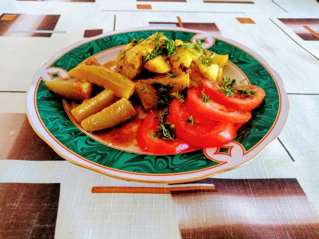 #пост #меню Просто, быстро и вкусно! Спасибо большое за вдохновение автору Светлане Скребневой @Sveta_Lana Ингредиенты: Картофель, Растительного масла (у меня оливковое), Помидор (для подачи), Огурцы по- грузински (для подачи), по вкусу специи, любимые пряности, Соль по вкусу, Зелень (для подачи) Способ приготовления: Взять примерно равные по размеру клубни картофеля, почистить и разрезать каждую картофелину на 6 - 8 частей. Выложить картофель в посуду, которую можно использовать в микроволновой печи. Это может быть пластиковый контейнер, стеклянная форма для выпечки или что-то другое. Картошку посолить, добавить по вкусу и желанию приправы и специи (у меня готовая приправа для ароматного картофеля), налить любое растительное масло и перемешать. На форму натянуть пищевую плёнку или одеть пакет(у меня рукав для запекания). Сделать ножом несколько проколов для выхода пара и отправить картофель в микроволновку. Включить режим СВЧ. Время запекания зависит от мощности вашей микроволновки. В