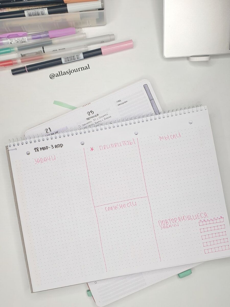 Я люблю экспериментировать с недельными разворотами, и в этот раз решила попробовать перенести в личное планирование один из типов отчетной системы, используемых в рабочем планировании. В этом подходе используются 3 основных элемента: 1. Задачи (Tasks) - список дел на неделю 2. Приоритеты (Key Priorities) - самое важное и срочное 3. Сложности (Key Issues) - если есть сложности в выполнении, требуется чья-то помощь или дополнительные ресурсы Я решила добавить секции: 4. Мысли - потому что у меня постоянно появляются мысли во время планирования и выполнения задач, и удобно иметь место для записи 5. Повторяющиеся задачи - этот подход из трекеров привычек, но здесь он не про привычки, а про задачи, которые хочешь делать каждый день, и не хочется записывать в список дел каждый день одно и то же На фото - простая разметка для такого планирования.