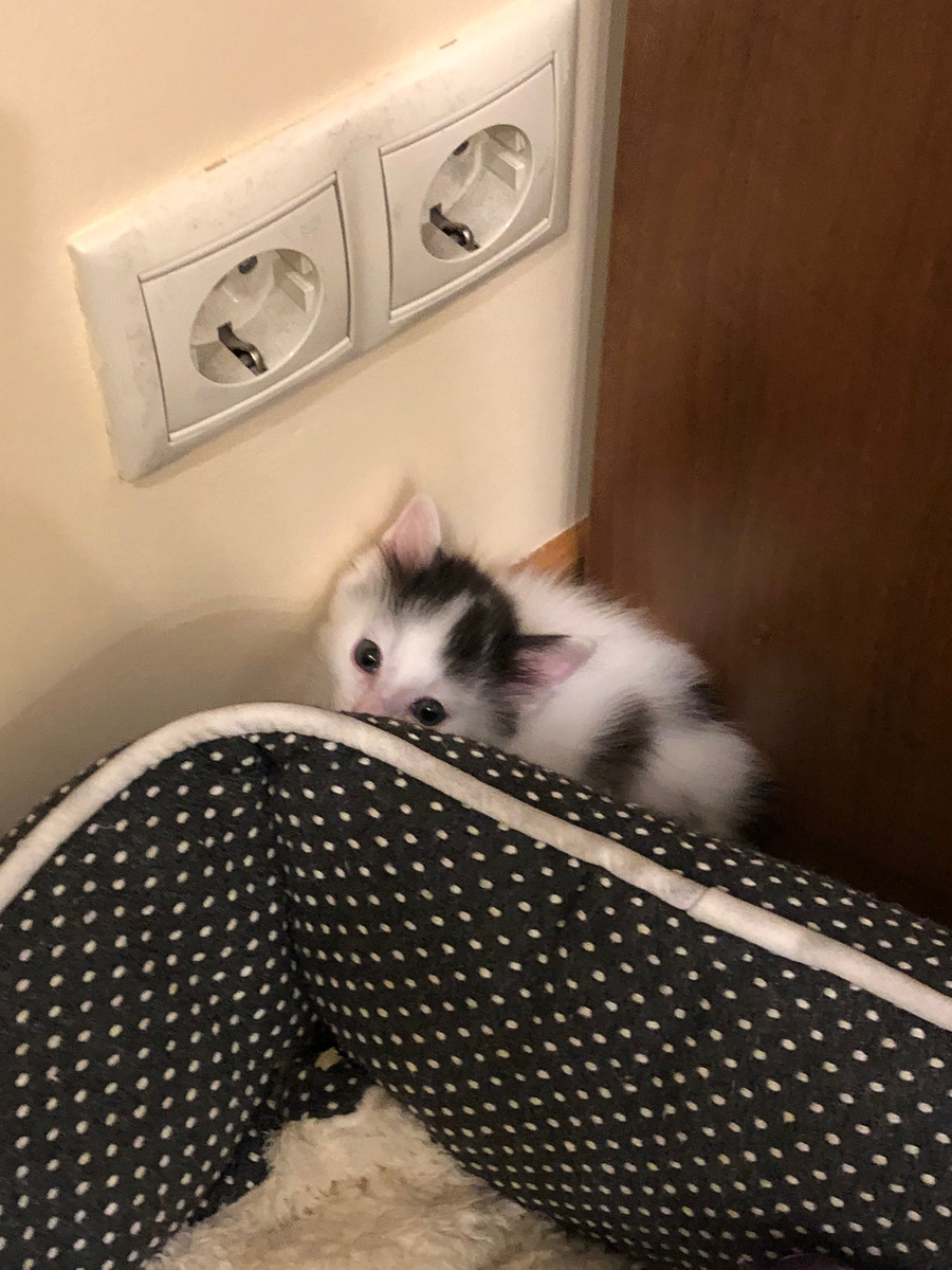 У меня было две собаки ( маленькие йоркширские терьеры )и я всегда была очень равнодушна к кошкам и никогда не думала, что у меня дома появиться даже не одна а сразу две кошки. Первую кошку мы взяли совсем маленьким котёнком, ее и ее сестёр подкинули на помойку совсем крошечных, они одни бы там точно не выжили. Добрые люди подобрали их, выкормили и вот мы поехали с парнем выбирать котёнка. Они все были очень классные, но одна просто покорила нас. Она была самая бойкая, пыталась везде залезть повыше и наблюдать с высоты. Мы решили взять ее. Ехала она домой в капюшоне парня, и постоянно мяукала. Мы привезли ее домой, у нас не было совершено никакого опыта в знакоместе кошек и собак. Она залезла в лежанку, и наблюдала за нами, а мы наблюдали за ней. Собаки проявили себя по разному. Старенькая собака немного испугалась неведомого зверя и смотрела на неё из угла комнаты, а молодая собака ничуть не испугалась и навязчиво пыталась познакомиться и поиграть с котёнком. Котёнок оказался не из ро