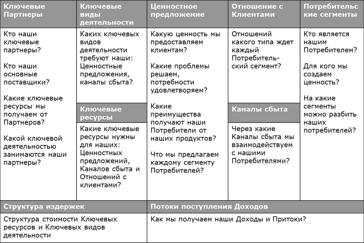Термин "Бизнес-модель" используется в нескольких значениях. В данном материале, буду рассматривать Бизнес-модель, как "мостик" между Стратегией и Системой ее реализации (модель Пинье, Остервальдера) Бизнес-модель необходима для того, чтобы ответить на все ключевые вопросы по отношению к нашим Товарам/Услугам, Каналам сбыта, Потребителям, Компании, Поставщикам, Партнерам и определить источники наших Доходов и структуру наших Расходов (издержек). Что это за вопросы? Пример приведен в таблице ниже: Если мы ответим на все эти вопросы ЧЕСТНО и КАЧЕСТВЕННО, то сможем понять себя (свою компанию) и сформировать инструменты (организационный дизайн и системы регулярного менеджмента) позволяющие реализовать Стратегию компании. Но даже если у Вас нет стратегии, то такая работа будет все равно не напрасна! Она позволит провести критический анализ бизнеса, определить необходимые изменения в деятельности компании. Простота таблицы очень обманчива! Для того чтобы заполнить каждую ячейку, Вам потребу