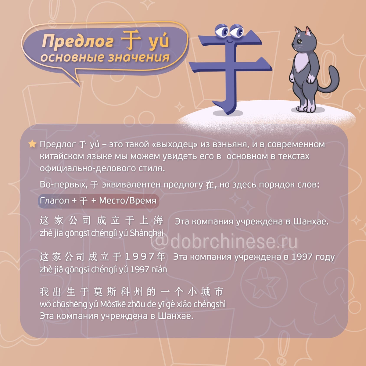 What’s up, 大家! Меня зовут Александр, основатель онлайн-школы «Добрый Китайский». Предлог 于 в китайском языке. Тема довольно интересная, я подготовил для Вас несколько слайдов. Слайд 1 Слайд 2 Слайд 3 Друзья, если пост оказался полезен, пожалуйста, поставьте лайк и подпишитесь на канал. Для меня это лучшая поддержка. #Добрый китайский #китайский язык #грамматика китайского #изучение китайского