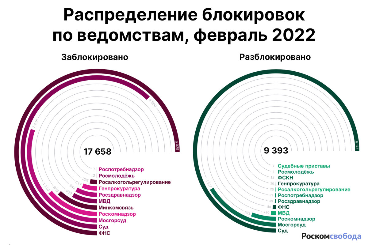 За февраль 2022 года в реестр запрещённых сайтов было внесено 17 658 ссылкок на интернет-ресурсы, исключено из реестра – более 9 тысяч.