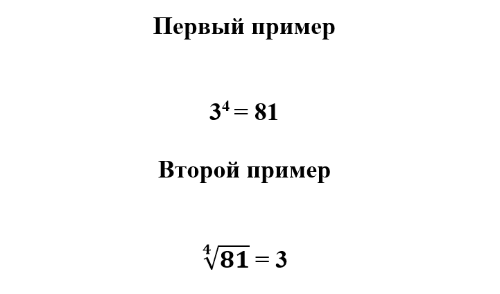 Возведение в степень. Возвести число в целую (вторую, третью, четвертую и т. д.) степень - значит повторить его сомножителем два, три, четыре и т. д. Число, повторяющееся сомножителем, называется основанием степени; число, указывающее, сколько раз берется одинаковый множитель, называется показателем степени. Результат называется степенью. Пример 1 (на картинке) здесь 3 - основание степени, 4 - показатель степени, 81 - степень; 3 = 3 x 3 x 3 x 3. Вторая степень называется иначе квадратом, третья степень - кубом. Первой степенью числа называют само это число. Извлечение корня. Извлечение корня есть нахождение основания степени по степени и ее показателю. Данная степень получает название подкоренного числа, данный показатель - показателя корня, искомое основание степени называется корнем. Пример 2 . Здесь 81 - подкоренное число, 4 - показатель корпя, 3 - корень. Возведение числа 3 в четвертую степень дает 81:34 = 81. Корень второй степени называется иначе квадратным; корень третьей с