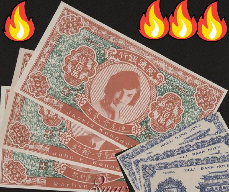 Уже месяц филиал ада на Земле. Мне вспомнился #купюрныйфакт: «адские деньги» Китая, чья история куда романтичнее, чем наша реальность. По легенде, христианские миссионеры в Китае всем китайцам пророчили попадание в ад, вера-то не истинная. Китайцы, к слову сказать политеисты – на их территории исповедовали и конфуцианство, и даосизм, и буддизм, и ислам, а также другие, не такие распространённые религии, – решили, что словом «hell» обозначают загробный мир. В китайской культуре после одной жизни начинается другая, к которой нужно подготовиться, и нужны в первую очередь деньги, как всегда и везде. Традиции сжигать ненастоящие деньги уже более 2,5 тысяч лет. Эти денежные знаки обычно объединяет Надпись Hell Bank Note, часто купюру украшают символы китайской культуры, иногда известные личности, как на банкнотах, которые вы видите ниже. «Адские» деньги – это ритуальные деньги, их также называют «деньгами загробного банка» или «бумагой из преисподней». Тратить их предполагается в загробн