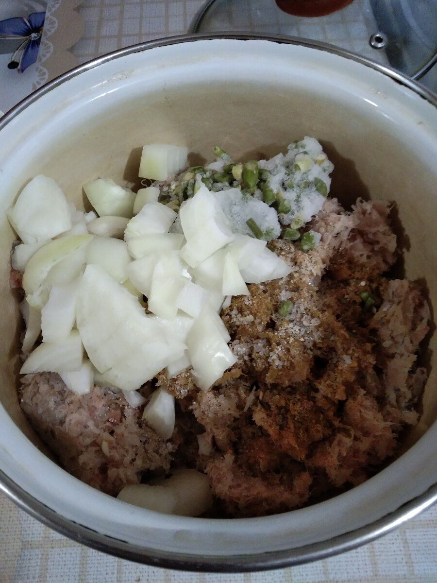 И снова здравствуйте! Рыбные котлеты я готовлю довольно часто. Но в обычные дни я обязательно добавляю в фарш яйцо и размоченный хлеб. В Пост я долго подбиралась к таким котлетам, все думала - чем заменить яйцо в котлетах, чем связать фарш, чтобы котлеты не разваливались. Читала рецепты на просторах инета, смотрела видео - вариантов много. Кто-то добавляет манку, кто-то муку, кто-то вареную картошку, кто-то вареный рис, хлеб или размоченные сухари. Но я все это кладу и в непостные котлеты (кроме картошки, риса и муки). Для рыбных котлет мне понадобилось: фарш трески - 400 г; лук репчатый - 70 г; чесночные стрелки - 30 г; мука 1 сорта - 20 г; манка - 20 г; специи - соль, приправа для рыбы, сушеный чеснок, черный молотый перец - по вкусу и на ваш выбор; масло растительное - 30 г; панировочные сухари - 30 г. Вес продуктов - 600 г; КБЖУ: 828/72,5/33,2/59,8. 1. В глубокую емкость (я взяла кастрюлю) выкладываю размороженный и отжатый фарш, добавляю к нему нарезанный репчатый лук, все специи