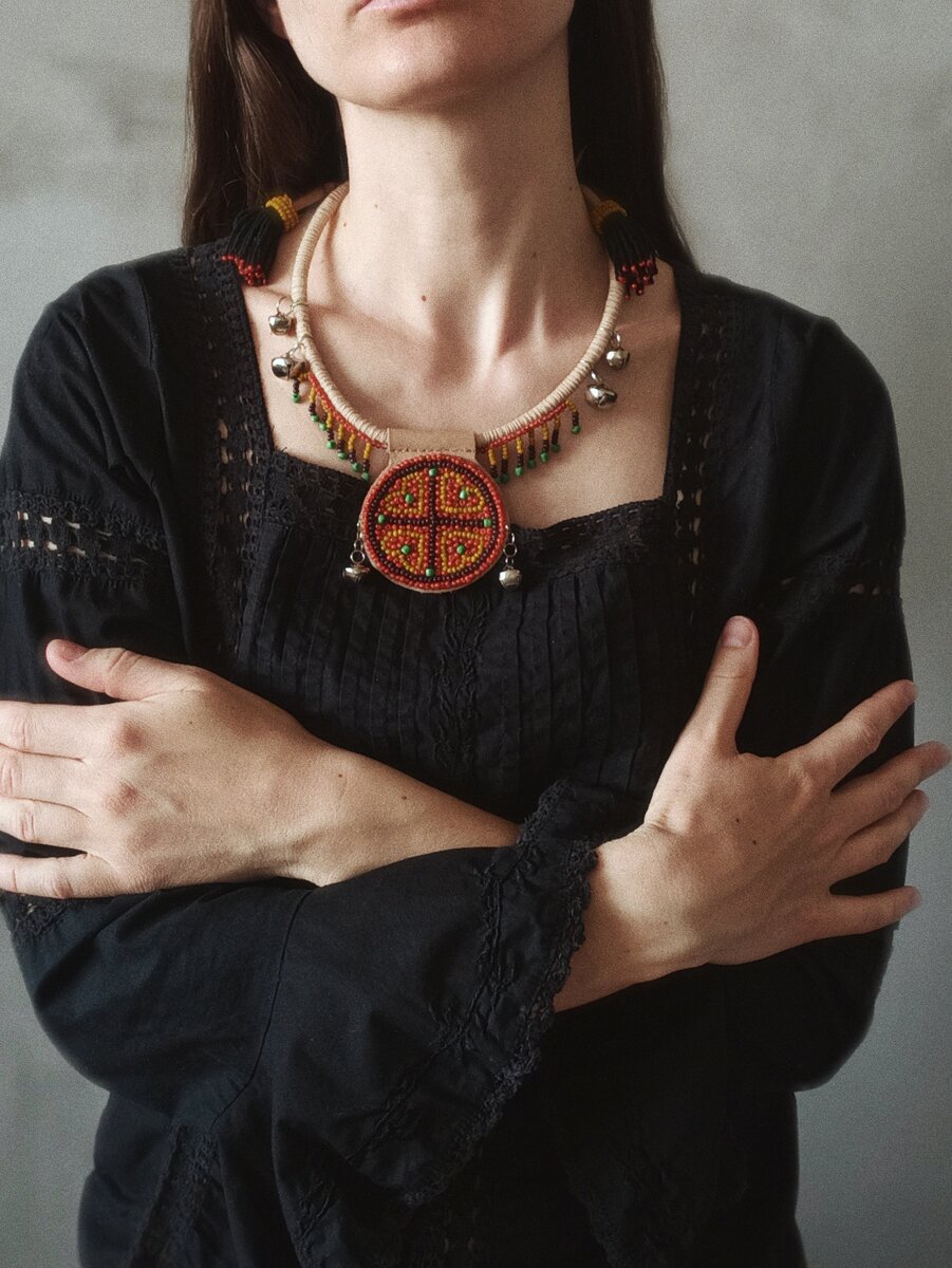 Хотя я даже и не знаю, бохо или джипси 😄 Мне оно навевает что-то о Румынии, фильм "Трансильвания" вспоминается. Хотя я вдохновение ищу в африканских племенных украшениях, здесь использовала христианский крест. Вышло ярко, дико, но по-европейски. В общем, Румыния 💃 Тут кожа, бисер, бубенцы. Работала недели полторы, примеряла и так, и сяк, в итоге как-то само сложилось. Прикреплю фото предыдущего варианта. Коль доступно для приобретения, пишите. Цена, думаю, около 3 тыс. руб., пока ещё не считала расходы. #бохо #этно #хиппи #украшения из бисера #колье #украшения из бисера #колье из бисераерабисерае