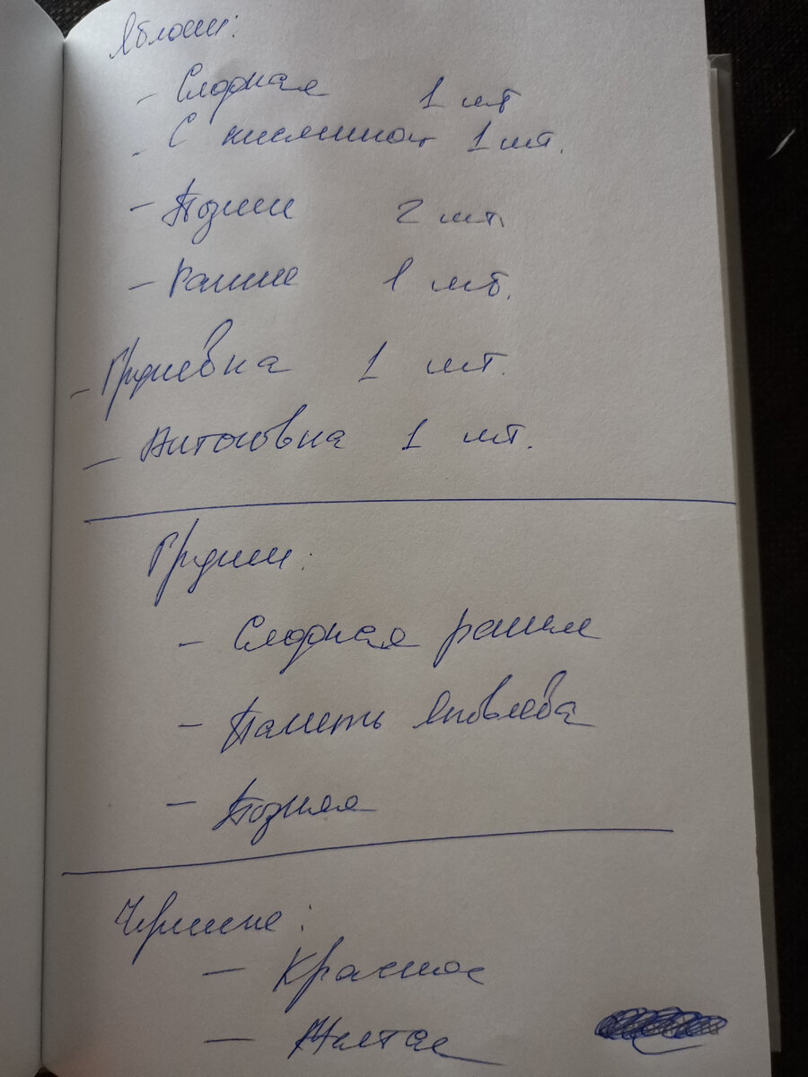 Как определиться, когда хочется посадить все и сразу... ведь столько соблазнов и иметь свой райский сад. Если просто понатыкать деревья по всему участку, то спасибо себе за это вы точно не скажете. Через 2-3 года слива осыпаться на тропинку и пачкать обувь, яблоня будет кидаться яблоками в беседку (а что, при сильном ветре что угодно может быть), а на месте прекрасно плодоносящей черешни вы решите ... построить баню, потому что больше негде. В первой части статьи я рассказывала про то, как определиться с местом закладки сада. Если не читали еще, то вот она: А сюда вернетесь потом. Все постепенно. Ну а кто уже в теме - едем дальше! Расширенный список Первым делом составляем расширенный список пожеланий, просто пишите все, что хотите посадить. Не задумываясь о рентабельности, урожайности, широте кроны. Не знаете названия сортов - пишите характеристики. Мой первый список выглядел вот так. Это только первая страница. У меня были точные определенности: Конкретные сорта яблонь, ко