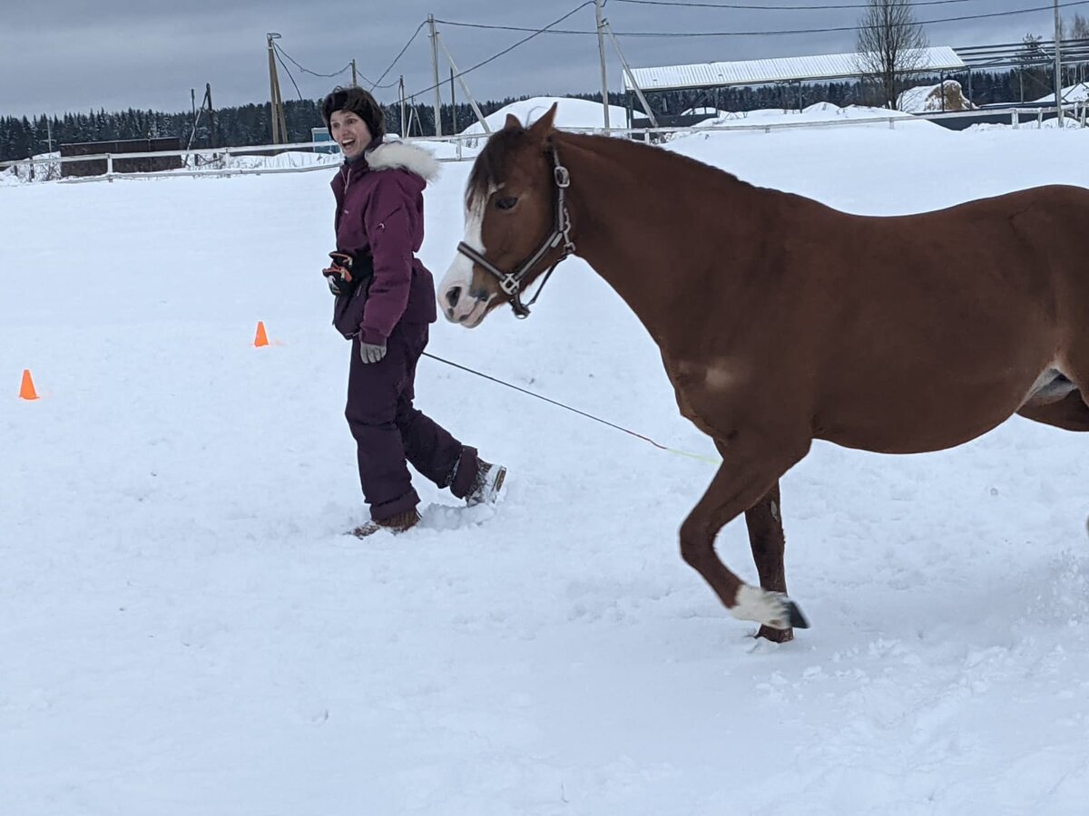 После активной работы как правило остаётся ещё отшагать лошадь в течение 10-20 минут, чтобы она остыла и подсохла. Можно конечно традиционно помёрзнуть в центре круга. А можно отшагивать лошадь так, чтобы обоим было интересно, а вам тепло. В этот раз я решила вновь позаниматься с тентом, но уже без опоры на стену манежа. Лошадь могла обойти тент с внешней стороны и это усложняло задание.