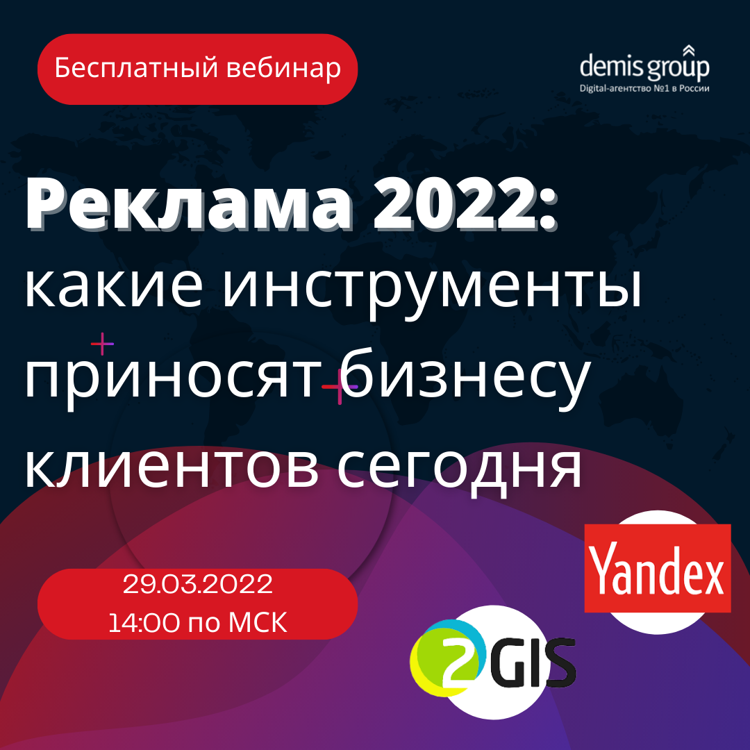 ❗️29 марта в 14:00 по МСК❗️Demis Group совместно с Яндекс и 2ГИС проведут бесплатный вебинар, на котором эксперты расскажут, какие рекламные инструменты и каналы принесут сегодня наибольшую пользу для бизнеса, а также дадут практические рекомендации по настройке рекламных кампаний.