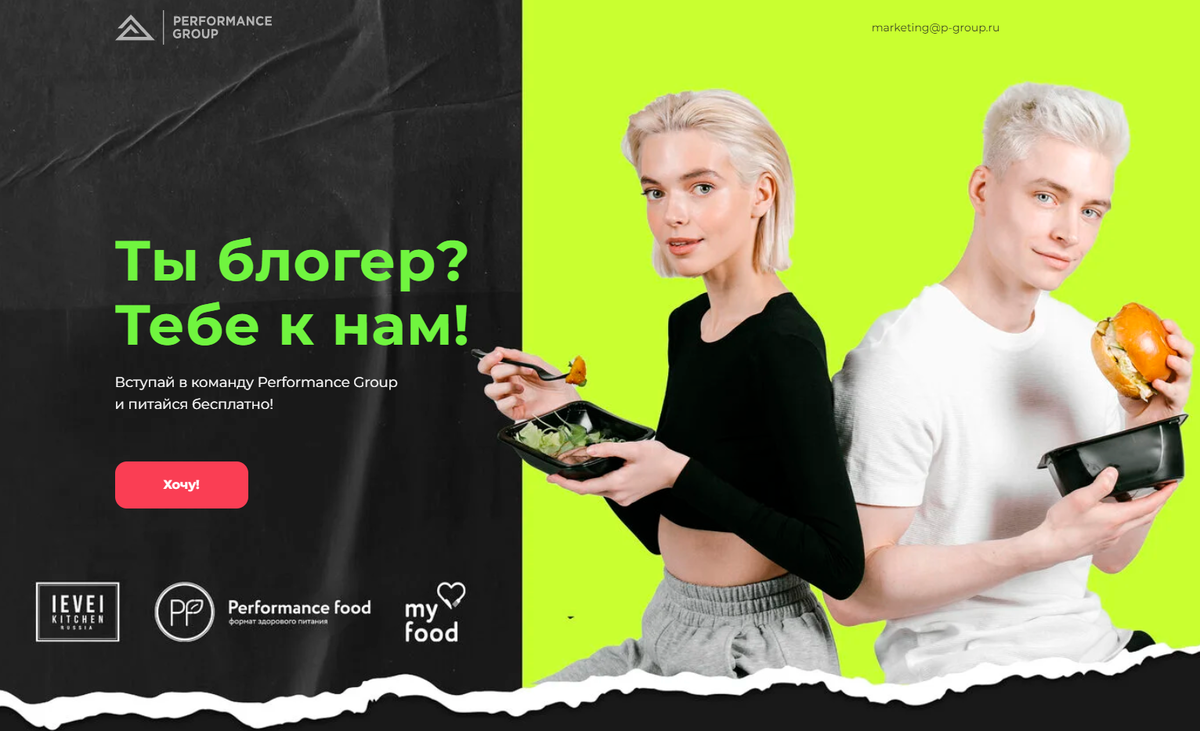 Performance Group поддержит блогеров, ведь мы за яркий интересный контент! В это непростое время многие блогеры потеряли основную площадку, которая была для них в прямом смысле рабочим местом. Они публиковали контент, рассказывали о своей жизни, общались с аудиторией. Мы очень хотим поддержать всех, для кого самовыражение необходимо как воздух. Поэтому мы запускаем особую акцию поддержки блогеров: вступай в команду Performance Group и питайся бесплатно! Что ты получишь? Три классных бренда с вкусной едой и сильным концептом. Интересные проекты и уверенность в завтрашнем дне. У всех есть шансы. Если у тебя интересный активный аккаунт и есть живая аудитория, мы сразу с тобой свяжемся! Творчество и яркие коллаборации! Помимо вкусного питания тебя ждут интересные творческие вызовы, громкие кейсы и яркие коллаборации. Ты сможешь работать как самостоятельно, так и в команде. Чувствовать поддержку профессионалов с многолетним опытом. Транслировать свои ценности, объединившись с крупнейшим