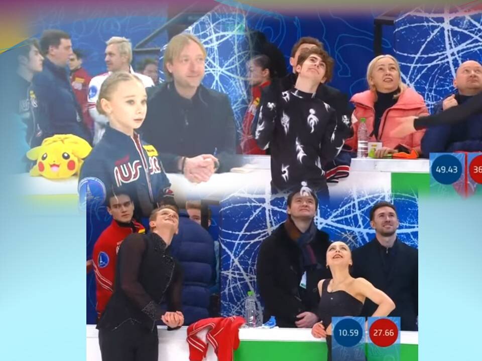Вспомним ещё раз состав команд. Синие: Камила Валиева, Елизавета Туктамышева, Евгений Семененко, Александр Самарин, Мишина/Галлямов, Павлюченко/Ходыкин, Майя Хромых, Вероника Жилина, Степанова/Букин. Капитан - Марк Кондратюк