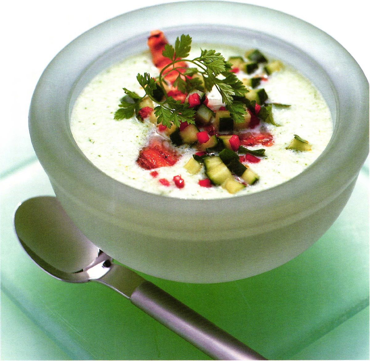 Обжаренный лосось придает горячую ноту освежающему вкусу этого холодного супа. суп эффектно смотрится, к тому же он довольно легкий - вы обязательно это оцените! Ингредиенты на 4 порции: 3 средних огурца 300 мл натурального греческого йогурта 250 мл овощного бульона, охлажденного 120 мл крем-фреш или жирной сметаны 1 ст.л. рубленого свежего кервеля 1 cm. л. рубленого свежего шнитт-лука 1 cm. л. рубленых листьев петрушки 1 маленький свежий красный перчик чили, без семян, очень мелко нарубленный Оливковое масло для смазывания сковороды 225 г филе лосося без кожи, разрезанного на 8 ломтиков Соль, свежемолотый черный перец Свежий кервель или шнитт-лук для украшения Приготовление: 1 Очистите два огурца, разрежьте вдоль пополам и выскребите семена. Мякоть крупно нарежьте и измельчите до состояния пюре в блендере или комбайне. 2 Добавьте в чашу блендера йогурт, бульон, сметану, кервель и шнитт-лук, взбейте до однородности. Посолите по вкусу, перелейте в миску, накройте крышкой и охладите. 3 О