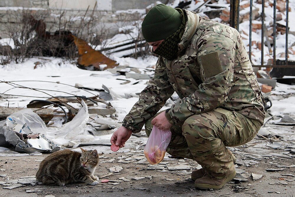 На днях одна беременная кошка появилась. Ползет, дрожит, царапает землю когтями и кричит. Еда для котят нужна катастрофически. Я дал ей тушенку. Все остальные псы и коты, кто был рядом, даже с места не стронулись. Хоть и голодные не меньше её. Даже зверье понимает, что беременную обижать нельзя. Она всю тушенку «сточила» и стала мне пыльный ботинок лизать. Благодарит так. Мы ей в ящике от патронов «лежку» сделали. Бушлат постелили. Такой вот полевой кошачий роддом. Пускай котят своих рожает.