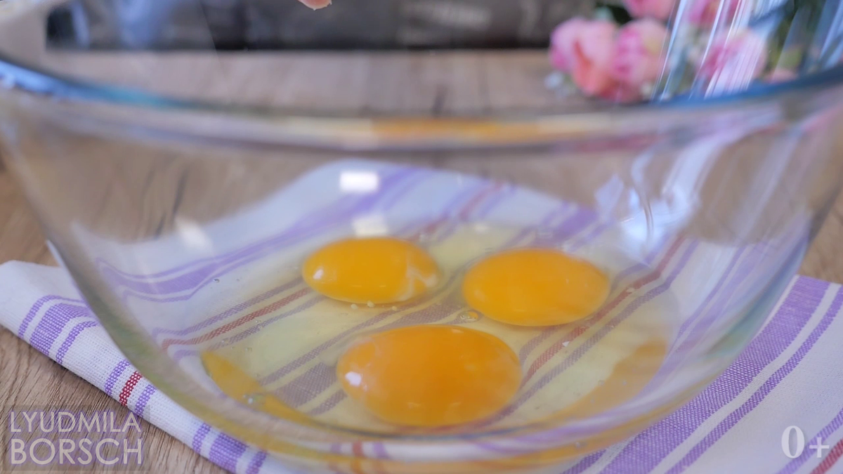В глубокую миску вбиваем три яйца. Сюда всыпаем соль, сахар. Взобьем все миксером