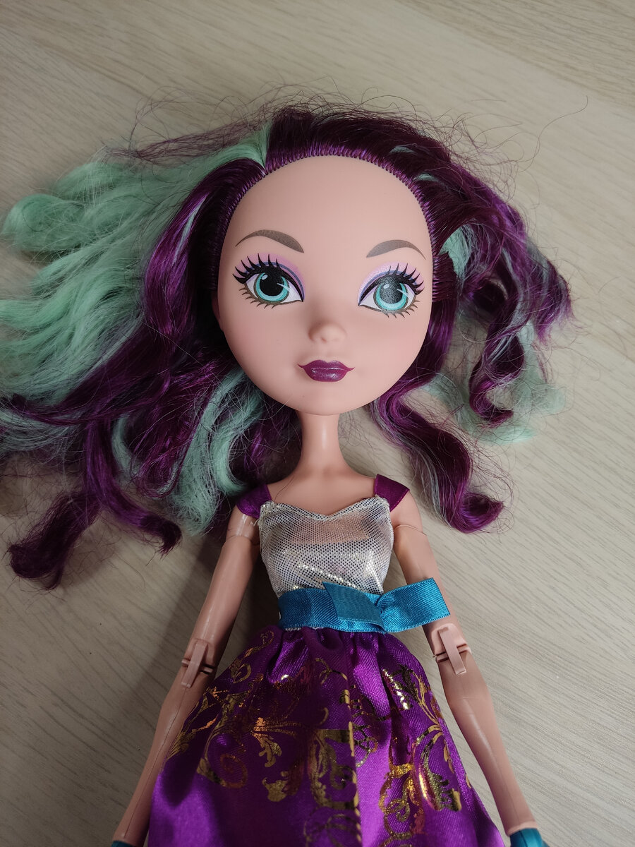 Всем привет! Меня зовут Александра, и я увлекаюсь преображением (ООАКом) кукол Monster High и Ever After High. Только недавно я закончила переделку большой (42 см) куклы Монстер Хай, которую превратила в королеву Марию Антуанетту. На переделку ушло почти полтора года - я не торопилась с ней. И вот снова мне хочется взяться за переделку ещё одной большой куклы. Многие из вас, наверняка, уже видели Мэдди в моих статьях. Тело у неё в точности, как у Гулиопы. А вот голова эверяшечная. Хотя, по пропорциям головы и тела она лучше, чем стандартные Эвер Афтер Хай - голова не смотрится, совсем большой. И она (голова) даже чуть меньше, чем у Гулиопы. Но жаль, что у этой куклы нет таких аппетитных форм, как стандартных Эвер Афтер Хай. Очень у них фигурки красивые. Но работаю с тем, что есть. Волосы у Мэдди очень плохие, даже хуже, чем у Гулиопы. Прошивка редкая. И очень некрасивые грязные цвета: бирюзовый и фиолетовый. Причём, цвета настолько некрасиво сочетаются друг с другом, что вид у ни