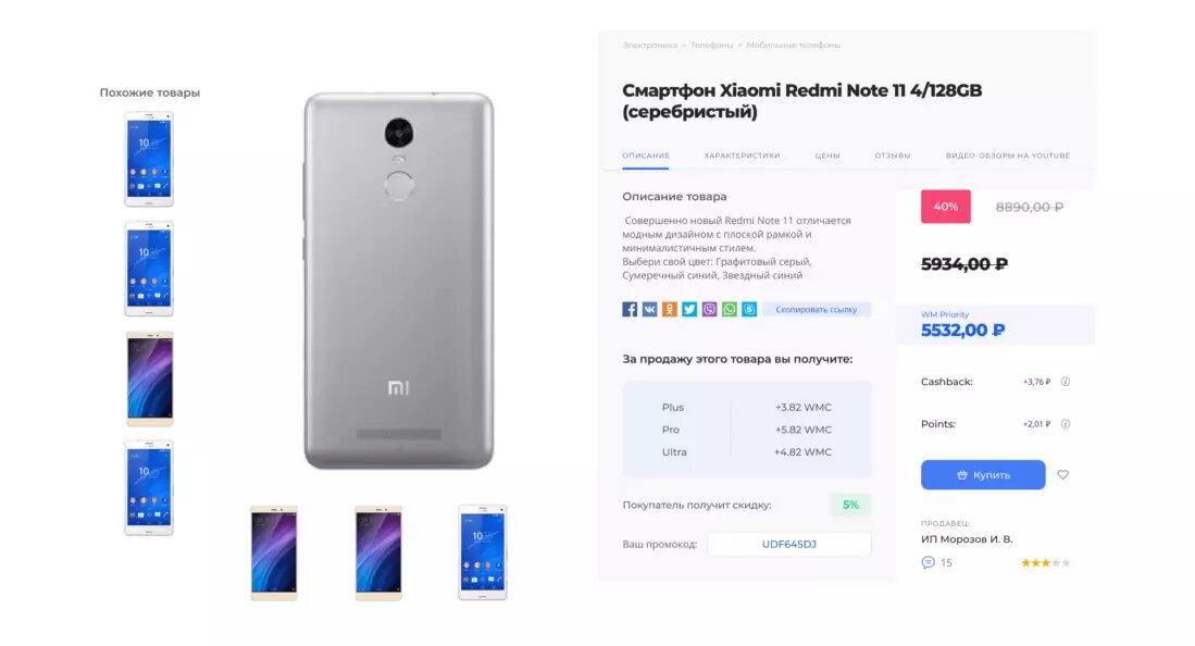 На странице товара справа показан больший выбор внутренней валюты (поинты, койны, кэшбек):