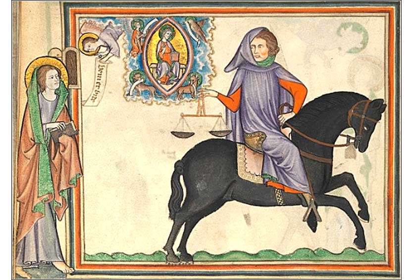 5 И когда Он снял третью печать, я слышал третье животное, говорящее: иди и смотри. Я взглянул, и вот, конь вороной, и на нем всадник, имеющий меру в руке своей. 6 И слышал я голос посреди четырех животных, говорящий: хиникс пшеницы за динарий, и три хиникса ячменя за динарий; елея же и вина не повреждай. Откровение 6:5-6