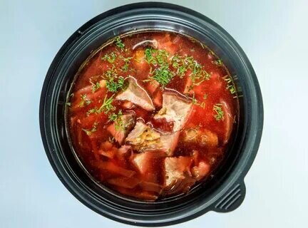 А вот следующий интересный рецепт носит название красного из-за своего коричневатого оттенка. Его дает предварительно обжаренное мясо и красный лук. Для этого оригинального рецепта понадобится: мякоть говядины – 0,5 кг, красный лук и корень сельдерея – по 100 г, вода – 2 л, сливочное масло – 80 г, соль, специи.
