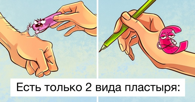 Надеемся, что вы оцените наши старания лайком и подпиской!) 1. Пластырь Существует только 2 вида пластырей: тот, который отклеивается в самый неподходящий момент и тот, который невозможно отклеить.