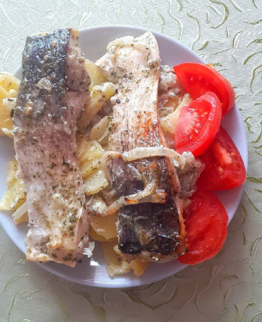 #меню #обед #пп #пост Хотя в блюде используется постный майонез, но получилось очень вкусно. Сочная, ароматная картошка и очень нежная рыба. Ингредиенты: ломтики толстолобика, картофеля, лук, постный майонез, домашний, чеснока, сушёной петрушки, соль, перец чёрный молотый, растительного масла Способ приготовления: Рыбу я размораживаю, солю, перчу и добавляю растительное масло на кануне. Закрываю чашку пищевой плёнкой и ставлю в холодильник до приготовления основного блюда. За час до запекания необходимо смешать майонез, измельчённый чеснок и петрушку. Лук почистить. Рыбу достать из холодильника. Лук порезать на четверть кольца и отправить его к рыбе. Выложить соус. Перемешать. Закрыть пищевой плёнкой и оставить мариновать минимум на 30 мин. За это время картофель почистить. До приготовления пока залить холодной водой. Подготовить рукав для запекания и форму для запекания. Через 30 мин включить духовку. Картофель нарезать тонкими ломтиками. Немного посолить с учётом, что сверху будет со